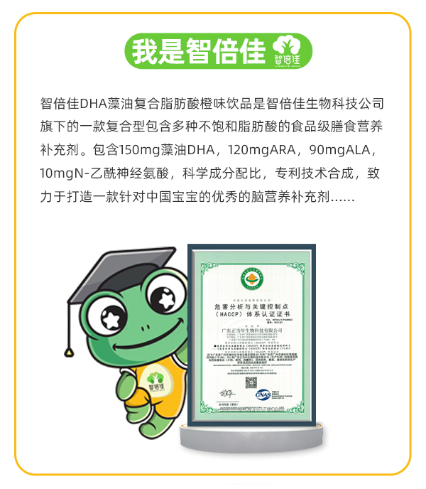 智倍佳DHA藻油复合脂肪酸橙味饮品是智倍佳生物科技公司旗下的一款复合型包含多种不饱和脂肪酸的食品级膳食营养补充剂。包含150mg藻油DHA,120mgARA,90mgALA,10mgN-乙酰神经氨酸,科学成分配比,专利技术合成,致力于打造一款针对中国宝宝的优秀的脑营养补充剂。
